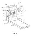As can be seen inFIGS. 2,3,5 and6,base12 can comprise aseparate motor housing32 andbelt platform34.Motor housing32 contains the various conventional motors and associated components for movingbelt20 and for raising and loweringbase12 andbelt platform34 for inclined exercising. Alternatively, each of the above disclosed elements can be located as desired in eithermotor housing32 orbelt platform34 by the person of ordinary skill in the art. In such a configuration, the inclination ofbelt20 is accomplished by an incline motor raising the front end ofbase12 relative to the rear end ofbase12, in a manner well known in the art. For example, as shown in a comparison ofFIGS. 5 and 6, an illustrative inclination mechanism is provided to permit inclination ofbelt platform34 andbelt20. Illustrative lift mechanisms include a leg lift, comprising an incline motor and front legs. Such lift mechanisms are known in the treadmill art.
