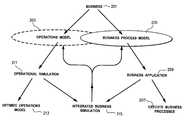 DETAILED DESCRIPTION OF THE EMBODIMENTSFIG. 2 shows a general implementation of the invention. The business201 of the enterprise includes anoperations model203 and abusiness process model205. The business orsoftware application209 is created using a framework-based implementation. This application is usually an abstraction of thebusiness process model205. On the other hand, theoperational simulation211 is the abstraction of theoperations model203. Theoperational simulation211 is used to optimize theoperations model213. The present invention uses theoperational simulation211 with the framework-basedbusiness application209 to perform an integratedbusiness simulation215. This allows for improvements to be made over both the business and the operations model at the same time.