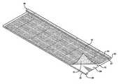 The Uni-Solar.com web site includes specification materials for various types of the photovoltaic material commercially available from Uni-Solar®. Thetypical sheet16 has photovoltaic material and an adhesive17 on a back surface of the sheet so that the sheet can be applied to the flat portion of aroofing panel12 with the adhesive bonding to the flat portion. The adhesive can be an ethylene propylene copolymer adhesive sealant, and it can include a microbial inhibitor. Thesheet16 has amorphous solar cells encapsulated in a high light transmissive polymer, where the high light transmissive polymer can be ETFE. Other types of photovoltaic sheet other than Uni-Solar® can be used with thekit10, and some of these other types are referenced above. One such type is available from Xunlight Corporation in Toledo, Ohio (www.xunlight.com). Another type is available from Gloria Spire Solar in Bedford, Mass. (www.gloriaspire.com). Still others are referenced on the internet.