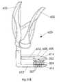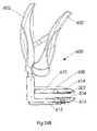 FIGS.21 and23A-23C, to which reference is now made, will be discussed together.FIG. 21 shows an exploded view of a typical, but non-limiting, example of anapplicator399 to be used with alinear compression assembly300, such as the assembly inFIG. 21.FIGS. 23A-23C show applicator399 attached tolinear compression assembly300 and advancing it to tissue (not shown) to be compressed (FIG. 23A), bringingassembly300 to its open configuration so as to allow for positioning of tissue (not shown) to be compressed betweencompression elements316 and318 of assembly300 (FIG. 23B) and then closing upper330 and lower350 elements ofassembly300 around the tissue (not shown) to be compressed (FIG. 23C).