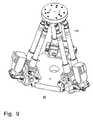 Each strut of one of the strut pairs58,60,62 is connected at its upper end, by means respectively of auniversal joint64, to atool plate66. Theuniversal joints64 are Cardan joints and thetool plate66 is configured in the present example as a disk. When spacing out theuniversal joints64 of each strut of astrut pair58,60,62, care should be taken to ensure that the struts can lie parallel to one another. Moreover, the diameter of thetool plate66 is chosen smaller than the outer diameter of thebase plate54, so that the strut pairs respectively have a specific angle to an imaginary perpendicular on thebase plate54, in any event in a starting position in which the strut pairs have an equal length. This starting position can, however, change accordingly in accordance with the length adjustment facility of the individual struts.