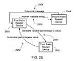 FIG. 25 is a block diagram showing a manner by which subscriptions between devices may be employed to monitor and/or control parameters in one or more audio-related devices with one or more other audio-related devices. A subscription may be used to notify one or more subscribers of a change in the value of a SV as previously discussed. In addition, a subscription may be used to direct changes to SV's in one or more other devices. Further, a combination of the subscriptions to monitor and control may be set up between audio-related devices. The example shown inFIG. 25 includes a first audio-relateddevice2502, a second audio-relateddevice2504 and a third audio-relateddevice2506.