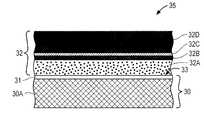FIG. 3 schematically shows astructure35 including aprecursor layer32 formed on a base30 in accordance with the present invention. Thebase30 comprises asubstrate30A and acontact layer31. Thesubstrate30A may be an insulating sheet or foil such as glass or polyimide or a conductive sheet or foil such as stainless steel or aluminum alloy web. Thecontact layer31 may comprise a conducting material such as Mo, Ta, Ru, Ir and Os among others. Theprecursor layer32 is grown on thetop surface33 of thecontact layer31. Theprecursor layer32 comprises three portions.