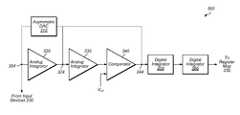 Analog integrator330, in one embodiment, is a delta-sigma second integrator that is adapted to integrate a value of a voltage atnode324. In various embodiments,integrator330 may be configured in a similar manner asintegrator320. In some embodiments,integrator330 may be adapted to have less gain thanintegrator320.Analog integrator330 is described in further detail below in conjunction withFIG. 7.
