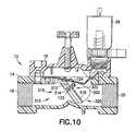 The above-described diaphragm valve basic components and their operation will be well understood by one of ordinary skill in the diaphragm valve art and, hence, will not be described in any great detail. Examples of known diaphragm valves and their operation are described, for example, in U.S. Pat. Nos. 4,336,918; 4,301,992; 4,893,645; 4,797,820; 4,477,051; 4,787,413; 5,853,026; and 6,557,580. However, unlike conventional diaphragm valves, thevalve10 of the invention includes operational elements and/or a relief system in accordance with the invention, as will now be described, which make the valve particularly useful as a flush valve in a waste water system.