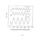 - iii) It is expected that other types (without common beampath) of dual-probe interferometry can be employed with good results for detection enhancement. The difference is that a reference pulse is directed on a portion of the material not exposed to pump beam irradiation and combined collinearly for overlapping on the detector with the associated probe pulse that was pump modified. Such a scheme is advantageous in at least one embodiment because both probe pulses can be made to contain similar amounts of non-coherent background (to be subtracted through interference) while exhibiting a similar sample effect on the probe pulse spectrum. Additional and independent phase compensation can be pursued, based on polarization waveplates, for optimal coherent probing realization.