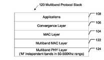 FIG. 2 shows various layers in amultiband protocol stack120, according to an example embodiment of the present invention, such an embodiment implemented by a modem suitable for communicating in a power line communication system that employs multiband communications. Themultiband protocol stack120 includes anapplication layer108,convergence layer106, andMAC layer104, similar to those of theOFDM stack100 discussed above. However, themultiband protocol stack120 also includes amultiband MAC layer122. Further, themultiband protocol stack120 includes a multibandphysical layer124, rather than a single bandphysical layer102. The multibandphysical layer124 enables communications using a plurality of different frequency bands within an overall operational frequency spectrum, (e.g., 50 kHz to 500 kHz).