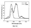 FIG. 11A is a combined PL/dark-field image of thenanoribbon46 on a dry oxide surface. The inset shows a magnified view of the blue end emission.FIG. 11B shows the same nanoribbon in a water environment, under a quartz coverslip. The inset shows resultant green emission.FIG. 11C shows the spectra of the two situations. The large red shift of the empirical cutoff wavelength (from 483 nm in air to ˜570 nm in water) is caused by the decrease in refractive index profile between the substrate and the cap medium. The more homogeneous cladding index improves wave confinement in the nanoribbon core. The effect was reversible by evaporating the water.