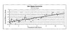 Finally, to identify the CPT-4 code most associated with efficiency scores for the Dermatologists,FIG. 8 provides an exemplary Procedure Code Report for the Dermatology specialty type, in accordance with the invention and example shown inFIG. 7. This report shows one line for each CPT-4 code being evaluated as a potential MedMarker for the given sub-service category of ambulatory surgical services. One example is the Pearson's correlation computed for CPT-4 11100 shown inFIG. 7. The first column in the report contains the statistical measurement (e.g. Pearson's correlation coefficient) calculated for pairs of efficiency scores and CPT-4 scores for that CPT-4 code. The second column contains the corresponding CPT-4 procedure code. This is followed by columns for a short name for the CPT-4 code, an average rate per episode for this code, and an average cost per procedure. The CPT-4 codes with sufficiently high positive or negative correlations are considered as MedMarkers. In thisFIG. 8, CPT-4procedure 11100 has a correlation of 0.289, 11101 has a correlation of 0.218, 11401 has a correlation of 0.302, and 11402 has a correlation coefficient of 0.221. These all have a correlation coefficient greater than 0.2, which is an exemplary cutoff in one implementation of the present invention, and these services, therefore, may be considered as potential MedMarkers. They all have a relatively high correlation between efficiency scores and CPT-4 scores. The remainder of the CPT-4 codes listed for this sub-service category have lower correlation coefficients, are thus less correlated, and are preferably eliminated from consideration as potential MedMarkers.