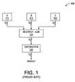 DETAILED DESCRIPTIONFIG. 1 is a block diagram illustrating a conventionalarithmetic processing unit100 operable to perform saturation arithmetic as previously known.Arithmetic processing unit100 performs a multiply-add calculation by multiplying two operands together to obtain a product, and adding the product to a third operand to provide an intermediate result. A saturation detection circuit receives the intermediate result and provides a final result of the calculation.Arithmetic processing unit100 includes amultiplicand operand112 labeled “A,” amultiplier operand114 labeled “B,” anaddend operand116 labeled “C,” a multiply-add module120 to provide an intermediate result, and asaturation module190 to provide a final result labeled “RESULT.”
