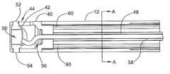 FIG. 3 illustrates a cross sectional view of the distal end of thecatheter assembly10. Thetransducer housing42 includesupper pin52 andlower pin54. Theupper pin52 is received inslot44 ofcollar40 and thelower pin54 is received within a reciprocal circular opening in thecollar40. A function of the slot is to facilitate manufacture of the device and more particularly insertion of thetransducer housing42 into thecollar40. In this regard, thehousing42 may be placed in thecollar40 at an angle with thepin54 being placed in the reciprocal hole. Thepin52 freely translates along theslot44 as thehousing42 is placed in a final upright position.