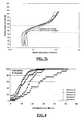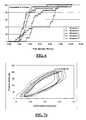 FIG. 7bis a graph of pressure deformation curves during the increasing pressure phases ofcycles1,5,10,30,50, and100, showing the meaningful parts of the curve. In comparison with the graph ofFIG. 7a, it will be noted that the stability of the mat throughout the cycling, which is inversely proportional to the displacement of the curves (in the x direction) between the first and last cycles, is significantly improved. Specifically that about one fifth the displacement of the mats consolidated as per the second forming method will be noted. At the same time it is noted that the width of the curve was lower indicating a stronger cohesion of the material and a smaller deformation in response to an equal stress. Furthermore the linearity of the stress-strain curve is better, showing that the artifact attributed to the unfolding of the balloon in the earlier example is removed.