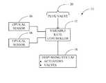 InFIG. 1A asystem10 includes avariable rate controller12. A dispensingsystem14 is operatively connected to thevariable rate controller12 and thevariable rate controller12 is configured to control the dispensingsystem14. The dispensingsystem14 is configured to dispense an agrochemical and may use actuators, valves, or other components to do so. Also insystem10, anoptical sensor16 and anoptical sensor18 are operatively connected to thevariable rate controller12. Although two optical sensors are shown, the present invention contemplates more or fewer sensors being used. Thevariable rate controller12 receives aplug value20. Theplug value20 may be hard coded, user specified, or otherwise determined. Theplug value20 may be downloadable or definable by the user. Theplug value20 is used in at least initial calibration of the system. The present invention contemplates that the system does not need further calibrations from a user after the initial calibration and can adjust based on measurements using theoptical sensors16,18. Theoptical sensor16 may be used for sensing plant growth parameters and theoptical sensor18 may be used for sensing soil color parameters. Of course, different configurations of sensors may be used and different types of sensors. For example, the soil sensors may be electromagnetic, electrochemical, optical, or force sensors.