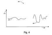 After some change occurs, such as a pathological change in the patient's heart, the second temporal profile440 may be plotted using cardiac cycles occurring after the change. As is evident in the second temporal profile440 versus the firsttemporal profile430, the variance of the second temporal profile440 is significantly larger than the variance of the firsttemporal profile430. Changes such as this may be detected and used for arrhythmia discrimination in accordance with the present invention.
