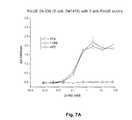 FIG. 13 shows the effect of 12 week treatment with antibody 11E6 on amyloid plaque deposits in Tg2576 mice. Area covered with plaques (A,B) and number of plaques (C,D) as detected by labelling with the anti Aβ antibody 6G1 after 11E6 or IgG1 control antibody treatment (n=1 g/group) is shown. Treatment with 11E6 reduced area covered by and number of deposits in the neocortex by 24.5% (A) and 26.8% (C), respectively. Statistical analysis revealed a strong trend (asterisks in brackets, p<0.06; Mann-Whitney U-test). The reduction was statistically significant in the frontal cortex (asterisks, p<0.05; Mann-Whitney U-test) where the area of deposits was reduced by 23.5% (B) and their number by 26.8% (D) after 11E6 treatment.