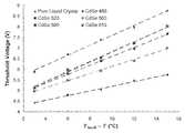 FIG. 6cshows a plot of threshold voltage versus the reduced temperature (TIso/N−T) forCdSe 480,CdSe 520,CdSe 560,CdSe 590,CdSe 610, and pure liquid crystal (LC1), demonstrating the linear response across the nematic range. In order of increasing threshold voltage, the lines representCdSe 480,CdSe 610,CdSe 520,CdSe 590,CdSe 560, and pure liquid crystal.