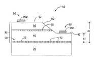 Now thatsubstrate20 is configured with a plurality ofLED regions10′ having a suitablypost-roughened substrate surface22,LEDs10 are fabricated using standard photolithography-based LED fabrication techniques. This includes, for example, formingp-n multilayer structure30 atop the roughenedsubstrate surface22 and then adding p-contact90pand n-contact90ntolayers50 and40, respectively, as shown inFIG. 1.