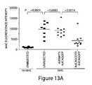 FIG. 13 panel A is a graph showing quantification of the MAC immunofluorescence at the area of GFP expression with MAC fluorescence intensity on the ordinate and nature of injected material to which RPE cells were pretreated on the abscissa. Control cells contacted with NHS have a MAC fluorescence intensity between 5,000 and 15,000, with a median of about 10,000. In contrast, control cells contacted with HI-NHS have a MAC fluorescence intensity of less than 2,500. RPE cells pretreated a mixture of AdEMPTY and AdCAGGFP and contacted with NHS have a MAC fluorescence intensity between 6,000 and 10,000, with a median of about 9,000. RPE cells pretreated with a mixture of AdCAGCD59 and AdCAGGFP and contacted with NHS have a MAC fluorescence intensity between 2,000 and 11,000, with a median less than 5,000 due to one out-lying point. This data show an overall reduction of about 55% in mean MAC fluorescence intensity for AdCAGCD59 and AdCAGGFP injected eyecup tissues (n=10) compared to control injected eyecup tissues (n=10), which was statistically significant (p=0.0014,FIG. 13 panel A).