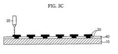 When the first, second and third layers are formed on thebase substrate10, they may be directly adhered to theelement60, or adhered thereto through another conductive layer. First,FIG. 3G illustrates directly mounting theelement60 on thebase substrate10 provided with the third layer. As shown inFIG. 3G, theelement60 may be mounted on the conductive layer of the third layer such that theelectrode50 of theelement60 contacts this conductive layer of the third layer, and the conductive layer of the third layer may be cured to adhere theelement60 to thebase substrate10 provided with the conductive layer of the third layer and the insulating layer of the third layer. The curing of the conductive layer of the third layer may be carried out by heating the conductive layer of the third layer to a temperature of about 200° C. The conductive layer and the insulating layer of the third layer may be simultaneously cured by simultaneously heating the conductive layer and the insulating layer. When the first layer, the second layer and the third layer are formed to provide a tri-layer structure, the three layers may be immediately cured after formation, or the three layers may be formed, theelement60 may be mounted thereon and the resulting structure may then cured simultaneously.