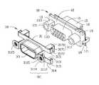 A plurality ofpins151 extends from a bottom of the connectingportion15. Two guidingmembers17 are arranged on opposite sides of the connectingportion15. Twoground pins171, at an acute angle to each other, extend from each guidingmember17. In an embodiment, theground pins171 are elastic, and the top edge of each guidingmember17 is aligned with the bottom edge of thepositioning slot18.
