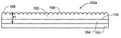 The coating that is applied to at least a portion of thesubstrate101 can be, for example, a radiation curable coating such as e-beam, UV, or the like, a water-based or solvent-based coating, varnishes, urethanes, acrylourethanes, any of a variety of suitable coatings. The coating can be applied to at least a portion ofsubstrate101 by any of a number of suitable coating techniques including, but not limited to, extruding, casting, printing such as inkjet printing, flexographic printing, rotogravure, curtain coating, spraying, gravure, mire rod coating, and the like. A total gauge thickness, i.e. substrate and patterned coating, can be anywhere from less than about 1 mil to about 40 mils, particularly less than 10 mils, and more particularly about less than 5 mils.