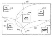 There may be times whenhost device1020 is able to communicate with two or more RF modules. During such times,host device1020 may determine which module to communicate with, depending on a given number of factors, including, for example, monitored signal strength. In some embodiments, the host device may switch from one module to another (or a wireless phone) while maintaining a telephone connection as the host device is moved from one region (where the host device can communicate with a first module) to another region (where the host device can communicate with a second module but not the first module).