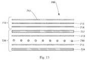 EXAMPLESThe Examples below each comprise a laminate700 constructed as shown inFIG. 13. The laminate700 includes afirst web710 andsecond web720. The examples illustrate the relationship of total basis and PE basis weight with respect to bond strength of a high pressure bond. Thefirst web710 includes a firstnonwoven layer712 joined to a secondnonwoven layer714 with 4.5 gsm of an adhesive713 sold under the trade name ZeroCreep, available from Bostik Inc., Wauwatosa, Wis. The first and secondnonwoven layers712 and714 are formed from core-sheath type bi-component fibers with the core of each fiber comprising polypropylene (“PP”) and the sheath comprising polyethylene (“PE”). For each example, the total basis weight of the first and secondnonwoven layers712 and714 and the basis weight percentages of PP and PE are shown in columns 2-5 of Table 1. The basis weight percentages of PP and PE are based on the total basis weight of the nonwoven. Thesecond web720 is a laminate that includes a first 100%PE film layer722, a second 100%PE film layer724, and anelastic strand layer730 disposed between the first and second film layers722 and724. The layers of thesecond web720 are joined together with 4.5 gsm of an adhesive713 sold under the trade name ZeroCreep, available from Bostik Inc., Wauwatosa, Wis. The total basis weight of the two film layers is shown in column 6 of Table 1. In the present Examples, the basis weight of the individual film layers is the same, however embodiments wherein the film layers have different basis weights are contemplated herein. In Examples 1, 4-5 and 7, thefirst web710 and thesecond web720 are bonded together using a high pressure bonding process, such as is known in the art, using a nip pressure of 90,000 pounds per square inch. In Examples 2-3, 6 and 8-10, thefirst web710 and thesecond web720 are bonded together using a high pressure bonding process, such as is known in the art, using a nip pressure of 110,000 pounds per square inch. The nip pressure is calculated by dividing the pressure applied to the roll, which is sometimes referred to as “air-bag pressure” (e.g., 40 or 50 psi), over the total area of the outermost surface of the tips of the “nubs” on the surface of the roll. It is believed that the disclosed differences in nip pressure used to form the high pressure bonds does not significantly affect the bond strength in the disclosed Examples.