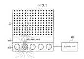 When the calculated coordinate value on the screen is transferred to thecontrol part400 as an input value, thecontrol unit400 determines an electromagnet existing at or nearest to the corresponding point using the coordinate value, and applies a voltage to the electromagnet. In this case, as illustrated inFIG. 5, a magnetic force is generated in a vertical direction from the electromagnet (e.g., the second electromagnet from left inFIG. 5). Although the voltage is described as applied to only one electromagnet, it is understood that aspects of the present invention are not limited thereto. For example, according to other aspects, the voltage may be applied to two or more electromagnets to generate magnetic forces when the input portion corresponds to a point or corresponds to a certain surface.