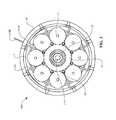 Also illustrated inFIG. 7, multiplecylindrical spacers84, of a generally cylindrical shape with bores at least in each end, are radially positioned inside of theflat spacers83 and also connect and position the stator discs81 and stator curves82. The bores of thecylindrical spacers84 accept onespacer fastener85 at each end. Thespacer fasteners85 are designed to clamp and hold the stator discs81a,81b, the stator curves82, theflat spacers83, and thecylindrical spacers84 together, which collectively form thecage89. Thecage89 maintains the radial and angular positions of theballs1 and aligns theballs1 with respect to one another.