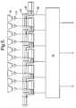 The invention avoids both of the above disadvantages, without increasing the number of control points. This is achieved by increasing the size of the sub-arrays but not the spacing. Thus the sub-arrays “overlap”, and each element participates in a number of sub-arrays. The number of control points (ports) is nevertheless reduced. Referring toFIG. 1, an example of an overlapping sub-array is shown, comprising a linear array ofantenna elements2. Foursub-arrays4 are formed, each comprising six elements, and each having a control point/respective interface port6. Threeelements8 from each sub-array also form part of an adjacent sub-array (on each side), so that in the major, central part of the antenna, each element (in this linear array example) participates in two sub-arrays.
