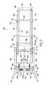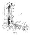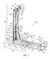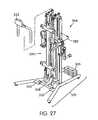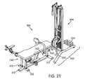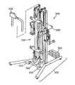 Two elongate, hollowtubular members106 serve as the major component of thebase structure102, connecting with thetower104 at contoured contact surfaces108 provided at the bottom of thetower104. Thetubular members106 are fixedly secured to thetower104 by means ofbolts110 inserted through thetubular members106 and contact surfaces108. Thetubular members106 extend outwardly to the rear of thetower104 and in parallel forward of thetower104. The outward extension of thetubular members106 behind thetower104 provides theapparatus100 with better stability. In general, thebase structure102 extends forwardly of thetower104 such that theapparatus100 cannot be tipped over forwardly except by theentire apparatus100 being tipped forwardly about the forward end of the base structure102 (i.e., tipped about the forward ends of the tubular members106). Eachtubular member106 is provided withrubberized endcaps112 to prevent slipping on smooth or polished floor surfaces.