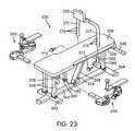 FIG. 23 is an exploded perspective view of thebench assembly330 in its raised operative position, illustrating the attachment of therotor assemblies200 and the removable chest andback support332. As shown, the connectingarm204 of therotor assemblies200 inserts into the tubular, hollowrectangular member378 at the forward end of thebench assembly330. As inbench assembly130, the tubular, hollowrectangular member378 is fixedly attached to the underside of thebench336, and may be provided with endcaps for use if therotors200 are not installed. In thebench assembly330,rubber feet380 are not installed on the tubular, hollow rectangular member; rather, they are installed on a separatetubular post381 which projects downwardly from the underside of thebench336.