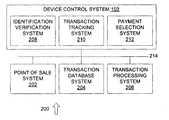 System200 includesdevice control system102 and point ofsale system202,transaction database system204,transaction processing system206,identification verification system208,transaction tracking system210, andpayment selection system212, each of which can be implemented in hardware, software or a suitable combination of hardware and software, and which can be one or more software systems operating on a suitable processing platform. For example, point ofsale system202,transaction database system204, andtransaction processing system206 can be implemented on a general purpose processing platform, general purpose server platform, mainframe platform, a workstation, or other suitable platforms, whereasdevice control system102 can be implemented on a personal device such as a personal digital assistant, palmtop computer, cell phone, or other suitable devices.