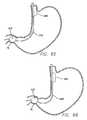 However, in another embodiment, astiffening wire584 or mandrel is placed down the lumen of theguide catheter tube582 to the stomach cavity as shown inFIG. 70. The stiffening wire has a preformed retraction shape, and may be made from any shapeable material, such as a resilient plastic, nitinol, or spring steel. In this embodiment, the guide catheter tube would need to be robust enough to contain the preformed stiffening wire as it is placed down the esophagus. Following the insertion of the stiffening wire, the guide catheter tube is removed from the patient's body leaving the pre-shaped stiffening wire in place within the stomach cavity as shown inFIG. 71. As shown in this figure, the stiffening wire includes abend586 toward the lesser curve of the stomach. This allows the tissue treatment device to be directed closer to the lesser curve of the stomach when it is placed within the stomach. Also, the stiffening wire includes ahook shape588 at its distal end that helps to retract tissue in the stomach cavity. It has also been contemplated that the distal end of the stiffening wire could form a full loop to retract unwanted tissue from the tissue treatment device. Referring next toFIG. 72, the tissue treatment device is then inserted into the stomach cavity over the stiffening wire, where the bend of the stiffening wire directs the tissue treatment device toward the lesser curve of the stomach. After the procedure is completed, the tissue treatment device is removed from the patient's body followed by the stiffening wire. To remove the stiffening wire, a retrieval catheter may be positioned over the stiffening wire and then both the retrieval catheter and stiffening wire may be removed from the patient.