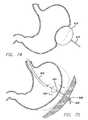 There are several other embodiments for expanding the stomach to retract or smooth the stomach wall. One embodiment is to insert a formedwire370 into the stomach that takes on a predetermined shape once it is inserted into the stomach cavity to hold tissue away from a target area. The formed wire can be nitinol that has a predetermined shape. To advance the formed wire into the stomach, atube371 can be used to house the formed wire, which is then advanced to the stomach. Once the tube reaches the stomach, the formed wire can be advanced out of the tube to resume its predetermined shape. For comparison reasons,FIG. 45 shows an illustration of an empty stomach, andFIG. 46 shows the cross-section of the stomach taken along line46-46 ofFIG. 45. Referring now toFIG. 47, a form wire is shown deployed within the stomach, andFIG. 48 shows the cross-section of the stomach taken along line48-48 ofFIG. 47. When the form wire is deployed within the remnant volume, the cross-section of the stomach is forced into a lenticular, or pancake shape, bringing the anterior and posterior sides of the stomach closer together, which allows a tissue treatment device to better acquire and perform a therapy to a target area. By stretching the stomach, any wrinkles or folds found within the stomach may also be smoothed out, allowing the tissue treatment device to acquire tissue from a target area without also acquiring wrinkles or folds from the stomach wall. To remove the form wire from the stomach cavity, the wire is simply pulled back into the tube and then removed from the body of the patient.