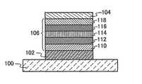 Further, in the structure shown inFIG. 1, theEL layer106 has thelayer110 including a composite material, a hole-transport layer112, a light-emittinglayer114, an electron-transport layer116, and an electron-injection layer118. For the components other than thelayer110 including a composite material and the light-emittinglayer114, omissions, changes, additions, or the like may be made as appropriate. In other words, the stacked-layer structure of theEL layer106 is formed in such a way that a light-emitting layer and a layer including a composite material are combined with layers including a substance having a high electron-transport property, a substance having a high hole-transport property, a substance having a high electron-injection property, a substance having a high hole-injection property, a substance having a bipolar property (a high electron-transport property and a high hole-transport property), or the like, as appropriate.
