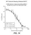 FIGS. 13 & 14 depict inhibition of HUVEC adhesion to immobilized human or mouse EGFL7 in vitro by humanized 4F11 variants. HUVECs (20,000 cells/well) were allowed to adhere to 96 well plates coated with 5 μg/ml human or murine EGFL7 in the presence of increasing concentrations of antibody. The number of cells that still adhered to the plates after washing were counted and calculated as percent of the total cells plated into each well.