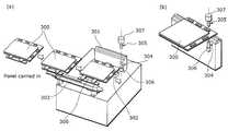 The mounting-completedpanel300 is placed on the back-upstage301. The paneltransfer stage unit302 transfers the mounting-completedpanel300 to the back-upstage301. The under-paneltransfer shaft unit303 transfers the mounting-completedpanel300 to the paneltransfer stage unit302.