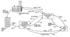 The general solution disclosed herein may be illustrated with the following example, with reference toFIG. 2. A metering device manufacturer orders preliminary credentials for each device from aRegistration Service220. (Note that the nodes pictured inFIG. 2 represent functional entities; these nodes may or may not correspond to discrete physical nodes or geographic locations.) In some embodiments, theRegistration Service220 provides preliminary credentials for each device, accompanied with all relevant information for downloadable USIM usage, including the PIMSI, the associated keys, and the Preliminary IMSI Identifier (PID), as shown at212. In other cases, theRegistration Service220 provides only the preliminary credentials, and the manufacturer generates corresponding PIDs, returning the PIDs to theRegistration Service220 as shown at222. In any case, the PID may be a numeric or alphanumeric password or other code. In some cases, the PID is preferably human-readable, although this is not necessarily the case.