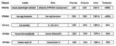 FIG. 1 illustrates the diagrams of Plasmid DNAs. Each vector has a pUC19 origin of replication and a kanamycin resistance gene for plasmid growth inE. colibacteria. CMV=human cytomegalovirus promoter and enhancer; CMV-A=human cytomegalovirus intron A; mRGB=modified rabbit β-globin polyadenylation signal; BGH=bovine growth hormone polyadenylation signal.