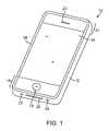 Electronic device10 may have ports such asport20.Port20, which may sometimes be referred to as a dock connector, 30-pin data port connector, multipin input-output connector, input-output port, or bus connector, may be used as an input-output port (e.g., when connectingdevice10 to a mating dock connected to a computer or other electronic device).Port20 may contain pins for receiving data and power signals.Device10 may also have audio and video jacks that allowdevice10 to interface with external components. Typical ports include power pins to recharge a battery withindevice10 or to operatedevice10 from a direct current (DC) power supply, data pins to exchange data with external components such as a personal computer or peripheral, audio-visual jacks to drive headphones, a monitor, or other external audio-video equipment, a subscriber identity module (SIM) card port to authorize cellular telephone service, a memory card slot, etc. The functions of some or all of these devices and the internal circuitry ofelectronic device10 can be controlled using input interface devices such astouch screen display16.