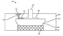 In embodiments ofelectrode assembly10 having areservoir70, theelectrode assembly10 can also include aself sealing port12 fluidically coupled toreservoir70 for filling the reservoir withtherapeutic agent80. Theself sealing port12 can comprise a silicone, or other elastomeric material, and allows theelectrode assembly10 to be filled withtherapeutic solution80 using a syringe and/or a mixing bottle with pointed tip and to do so using sterile technique. Typically,port12 will include achannel13 fluidically coupling theport12 to thereservoir70. In these and related embodiments,electrode40 is sized and positioned withinlayer20 such that a needle or other port penetrating tip used to do the injection, will not make contact withelectrode40. Also, an electrically insulating layer orbarrier14 can be positioned betweenport12 and/orchannel13 andelectrode40 to minimize the likelihood of any electrical conduction betweenport12 and/orchannel13 and the electrode.Barrier14 can comprise various insulating polymers and other materials known in the art and can also have sufficient hardness to reduce the likelihood of penetration ofelectrode40 by the needle tip or other port penetrating tip.