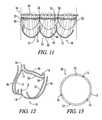 FIG. 10 illustrates a second embodiment of the intra-annular hemispherical mounting frame in a longitudinally opened position, overlaid on a longitudinally opened normal aortic valve and laid flat.