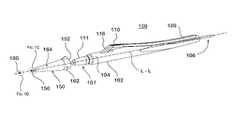 Referring toFIG. 1A, asystem100 to deliver or insert apunctum plug180 is shown in perspective view along a longitudinal axis L-L. Thesystem100 includes an insertion tool orinstrument102 that includesinstrument body104. Theinstrument body104 extends from a proximal end106 (i.e., the end nearest an operator holding theinstrument102 for its intended use) to a distal end107 (i.e., the end furthest away from an operator holding theinstrument102 for its intended use) along the longitudinal axis L-L. Theinstrument102 has anactuator110 disposed near thedistal end107. Theactuator110, in the form of a button, may be connected to anactuation member112, which is configured to move along the longitudinal axis L-L through abody opening114 provided in the instrument body. Theactuation member112 may be formed of any configuration as long as such configuration allows theactuation member112 to reciprocate along the longitudinal axis L-L in thebody opening114. Preferably, theactuation member112 is configured as a generally cylindrical rod. Theactuation member112 is connected to theactuator110 via anarm116 that is angled with respect to the longitudinal axis L-L. Thearm116 is coupled to theactuator110 via at least onesuitable hinge105, such as, for example, an unbiased hinge, spring-biased hinge or preferably aliving hinge105.