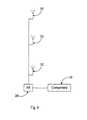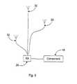 Likewise, for example,FIG. 8 illustrates oneRF power receiver26 connected to a plurality of receivingantennas32, where the receivingantennas32 are connected in parallel.FIG. 9 illustrates oneRF power receiver26 connected to a plurality of receivingantennas32, where the receivingantennas32 are connected in series. In either case, the advantages are increased power reception and increased probability of receiving sufficient power. As an example, one antenna may be in a different polarization or located in a dead spot. The result may be a reduced power output for that antenna. The other antennas, however, may be receiving sufficient power which is supplied to thereceiver26. It should be noted that the multiple antennas shown in any of the figures may be directly connected together or combined using a combiner or other combining device. Also, any type of antenna may be used with this or any other of the embodiments herein.