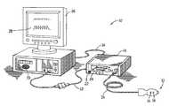 Monitor14 may be communicatively coupled to multi-parameter patient monitor26 via acable32 or34 that is coupled to a sensor input port or a digital communications port, respectively and/or may communicate wirelessly (not shown). In addition, monitor14 and/or multi-parameter patient monitor26 may be coupled to a network to enable the sharing of information with servers or other workstations (not shown).Monitor14 may be powered by a battery (not shown) or by a conventional power source such as a wall outlet.