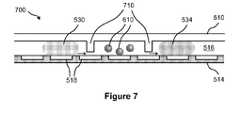 Droplet actuator700 operates substantially the same asdroplet actuator500 ofFIG. 5 anddroplet actuator600 ofFIG. 6. For example,FIG. 7 showssolvent droplet530 that is transported alongelectrodes518 into contact withbeads610, which are retained withinphysical barrier710. Consequently, thesolvent droplet530 can be transported using droplet operations into contact with thebeads610. The concentrated reagent associated withbeads610 is reconstituted into solution in order to formreagent droplet534.Reagent droplet534 may then be subject to further droplet operations, e.g., transportingreagent droplet534 away frombeads610, which are retained in place bybarrier710, for performing assay operations.