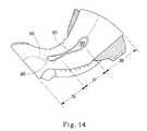 FIG. 13 is a plan view of the body-facing surface of the disposable absorbent article depicted inFIG. 12 with visible serviceable indicia providing patterns to create a smooth transition between the first waist region and the second waist region of the article.