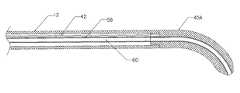 A customized shape of the distal end of theultrasound catheter10 can also be achieved by shaping the distal end of theultrasound transmission member42 prior to the final assembly. Shaping can be accomplished by carefully bending the distal end of theultrasound transmission member42 using, for example, a mandrel and inducing a mechanical deformation on its distal end until a desired permanent shape is achieved, similar to methods used to shape conventional guidewires. It is important that the bend is longer and smooth without sudden angulations or dents, so that ultrasound energy propagation will not cause stress concentration areas and potential breakage of the ultrasound transmission member. Then, the shaped distal end of thetransmission member42 is placed inside thecatheter body12 which will assume a shape that corresponds to the shape of the shaped ultrasound transmission member. To facilitate shaping, the distal end of anultrasound transmission member42 made of a superelastic alloy may be pre-heated above the martensitic temperature transformation. Heating theultrasound transmission member42 to a desired shape or angle will transform the alloy from the martensitic stage to the austenitic stage and facilitate the shaping process. After cooling at room temperature, the shaped portion of thetransmission member42 will permanently retain a new desired angulation.