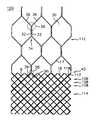 FIG. 21 is an illustration of a portion of a transition region between a hybrid polygonal cell/overlapping zig-zag stent section and a braided stent section where the tubular stent has been cut open along a line parallel to the stent axis and flattened, and the overlapping zig-zag end winding comprises sets of double filaments that intersect one another.